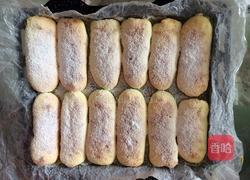 8.表层均匀筛入糖粉,我是糖粉不多,用手捻上去的,如此烤出来表面颜色不均匀,过一分钟第三筛入一次糖粉,烤箱中层上下火190度,10分钟左右,颜色变黄,手压有弹性就出炉了,放凉后就能做提拉米苏了