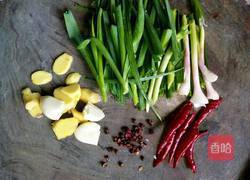 5.蒜苗洗干净切段,姜去皮切片,大蒜去皮拍扁,花椒粒和干辣椒适当。