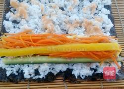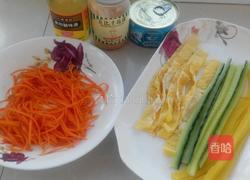 9.上面依次放黄瓜、鸡蛋皮、金枪鱼罐头、胡萝卜和盐渍萝卜。(金枪鱼罐头放中间,不要放最上边,要不卷的时候散)