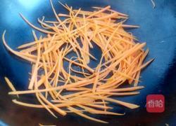 2.就着摊完鸡蛋的锅底把切成丝的胡萝卜小火炒软。