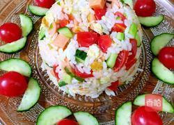 7.拿一个盘子再把碗里的炒饭倒扣出来,在周围放了一些圣女果和黄瓜当装饰,不放也可以哦!