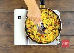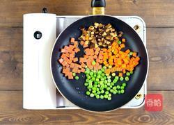 3.不粘锅倒油烧热,倒入火腿丁、香菇丁、豌豆粒、胡萝卜丁炒香,倒入咸蛋黄炒匀,再倒入糯米,翻炒均匀