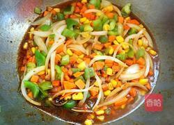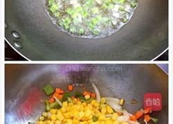 4.锅中倒入适当的玉米油,油六七成热的时候放入葱头爆出香味,再放入青椒、洋葱、胡萝卜和玉米粒翻炒均匀