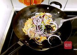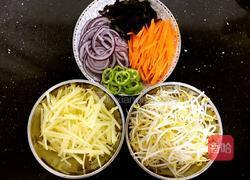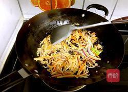 12.肉馅变色后,依次放入胡萝卜丝、土豆丝、木耳、豆芽、圆葱。