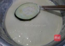 6.取一个大碗,加半碗水,打一个鸡蛋,到一点食用油拌匀,慢慢加面粉,一边加一边搅拌,直到成为比较浓稠的面糊,放一片茄子看看能否挂上面糊,假如挂不上就在加点面粉