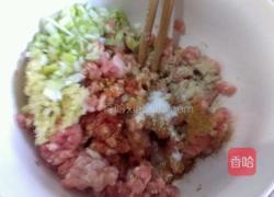 2.肉馅里放葱姜末,盐,胡椒粉,生抽,香油搅拌均匀