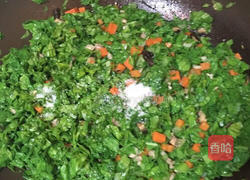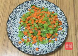 18.倒入已经焯水的胡萝卜丁与芥菜丁,翻炒二三分钟入味