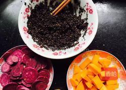 1.1.芝麻加油在锅里炒熟 加糖2.南瓜切小块 用电饭锅蒸(什么工具都自定)3.紫薯切片放在锅里煮