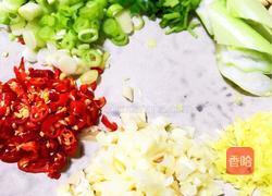 2.大葱切节,蒜剥皮,小红辣椒,姜,蒜,小葱,香菜、干辣椒切末备用