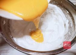 8.蛋黄液分三次倒入蛋清盆中。用翻拌的手法拌匀。